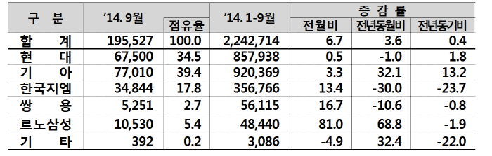 산업통상자원부에 따르면 9월 수출은 19만5,527대로 전년동월대비 3.6% 늘어난 것으로 집계됐다. 금액으로는 32억4천만달러로 6.9% 상승한 수치다. 같은기간 생산은 29만4,160대, 내수는 12만7,723대로 각각 2%, 12.2% 늘었다.