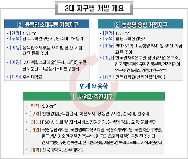 전북연구개발특구 전주에 사업화촉진지구 9.9㎢를 비롯, 완주 융복합 소재부품 거점지구 4.5㎢, 정읍 농생명 융합 거점지구 1.5㎢ 등 모두 15.9㎢(483만평)에 조성된다.