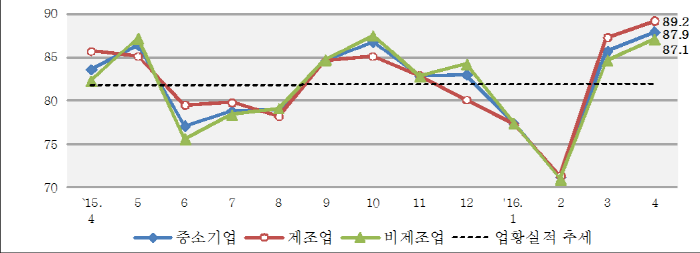 2016년 4월 중소기업 업황실적건강도지수(SBHI)는 전월대비 2.2 상승하고, 전년동월대비 4.3 상승한 87.9로 나타났으며 제조업은 전월대비 1.9 상승한 89.2를 기록했다. 비제조업은 건설업이 전월대비 2.2 상승하고 서비스업이 2.4 상승해 87.1로 나타났다.