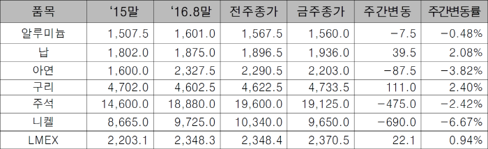 지난주 비철금속가격은 대부분의 품목이 하락한 가운데서도 납과 구리가 상승세를 이끌며 소폭의 보합세를 보였다.