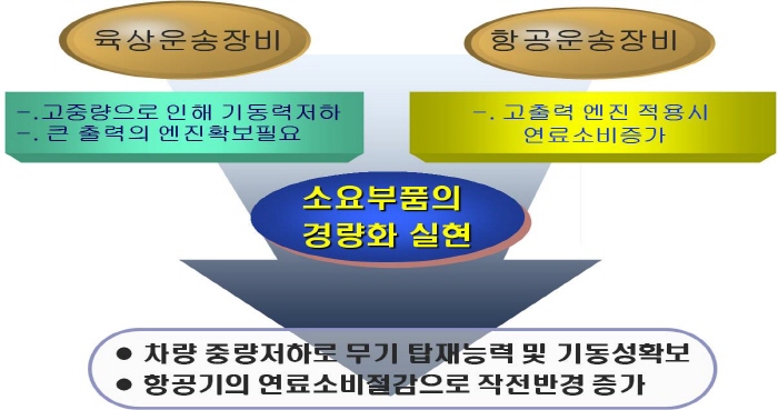 국방무기와 관련하여 최근 동향의 화두는 <그림 1>에 나타낸 바와 같이 경량화이다. 전통적인 철강소재에서 타이타늄, 알루미늄, 마그네슘, 탄소섬유를 사용하더라도 경량화에는 한계가 있으며 따라서 구조강성을 유지하면서 기능성까지 겸비한 부품의 개발이 요구되고 있으며 그 답은 적층제조 기술에 있다. 아울러 자동차와 같이 대량생산하는 부품이 아니고 다품종 소량생산이기 때문에 더더욱 방산무기 체계에 필요한 기술이기 때문이다.