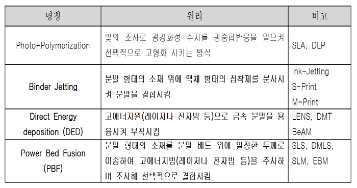 3D프린터는 공식적인 용어가 아니며 절삭가공(Subtractive Machining)과 대조되는 적층제조(Additive Manufacturing)가 공식적인 ASTM 용어이다. 이 적층제조기술은 총 7가지로 분류하고 있으나 금속과 관련된 기술은 크게 <표 1>에 나타낸 바와 같이 4가지 기술이 사용되고 있으며 금속 적층제조에 사용되는 소재는 △분말 기반형 △와이어 기반형 △박판기반형으로 나눌 수 있다. 분말기반형은 금속분말을 아토마이저 방식 등으로 급랭하여 구형화된 분말을 대부분 사용하며 Powder Bed Fusion(PBF)와 Directed Energy Deposition(DED) 방식이 대표적으로 널리 사용된다. 광경화성수지를 사용하는 Photo-Polymerization은 정밀주조용 왁스패턴에 활용되며, Binder Jetting 방식은 왁스패턴 및 사형몰드를 제조하는 방식이다.