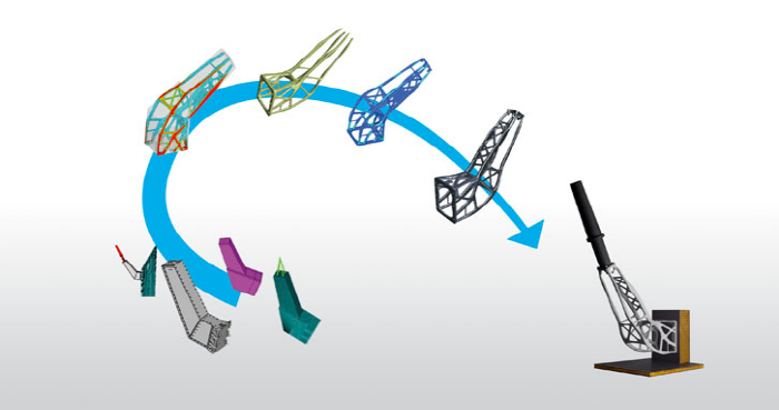 둘째는 ‘Complexity for free’이다. <그림 3>은 인공위성에 사용되는 안테나 브라켓으로 내부를 중공화하거나 강성이 요구되지 않는 영역을 과감히 제거할 수 있는 최적설계(topology optimization)를 보여준다. 이러한 설계는 동일한 구조강성을 확보가 가능하고 소재 절감 및 경량화에도 기여할 수 있는 장점이 있다.