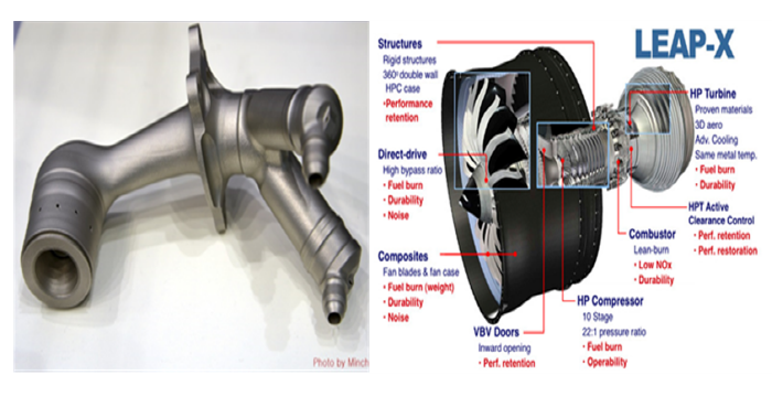 이 연료분사노즐은 기존 부품에 비해 5배의 수명이 연장되며 연료소모의 10%의 절약이 가능하며 사용된 소재는 Co-Cr-Mo 합금으로 제조되었으며 LEAP 제트 엔진에 사용할 계획이다. 이 부품을 대량생산하기 위해 ConceptLaser, Arcam사를 인수하고 2020년경에 10만개의 노즐을 생산할 계획으로 있다. 보잉은 항공기 소형부품 300여 종을 3D프린터로 제작 중에 있으며 기타 미사일 부품, 전투기 등 방산 관련부품과 신차 개발 등에도 적용사례와 저비용화를 실현한 사례들이 속속 공개되고 있다.