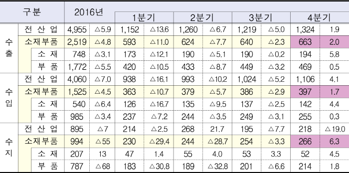 4분기 들어 수출입·무역수지가 모두 플러스로 전환됐고, 특히 소재 무역수지는 2016년 들어 4분기 연속 증가했다.