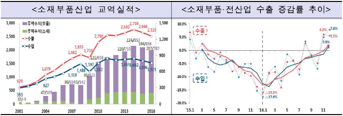 2016년 소재부품 교역은 세계 각국의 보호무역주의 확산, 중국의 가공무역 제한정책 등으로 2015년 대비 흑자폭은 다소 감소했으나 수출입 증감률은 2016년 1분기를 기점으로 감소세가 완화돼 4분기에는 플러스로 전환됐다.
