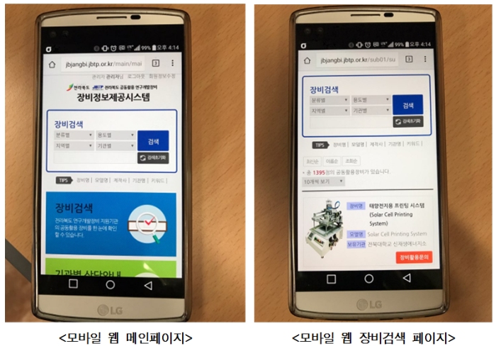 기존 PC환경에서 제공하는 ‘장비정보제공시스템’의 모든 메뉴와 기능을 스마트폰, 태블릿 등 모바일 기기에서 동일하게 이용할 수 있도록 모바일 서비스를 구축해 현재 운영 중에 있다.