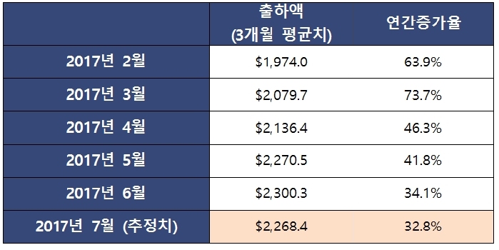 7월 출하액은 전월 장비출하액 23억달러보다 1.4% 하락했지만 전년동월 출하액 17억1,000만달러와 비교해서는 32.8% 상승했다.