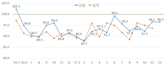 2017년 내내 기업 심리가 부정적이었는데, 이처럼 전망치가 한 번도 기준선을 넘지 못한 해는 외환위기(1997년, 1998년) 이후 올해가 처음이다. 경제의 구조적 문제와 대내외 불확실성이 지속되면서 기업들의 우려가 더해지고 있다.