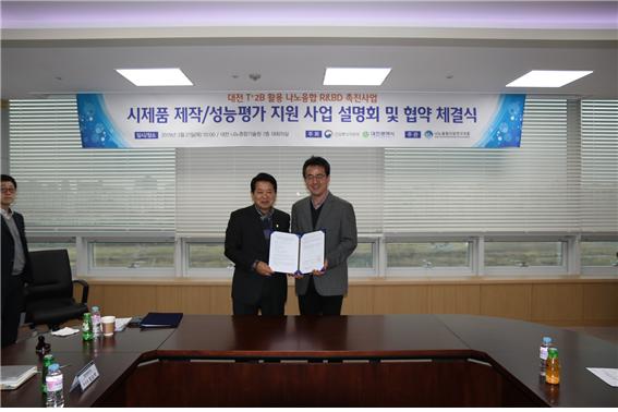 ▲ 대전 T2B 활용 나노융합 기술사업화 촉진사업 설명회에서 문창용 대전시 과학산업국장(右)과 한상록 나노조합 전무가 협약 체결후 기념촬영에 응하고 있다.