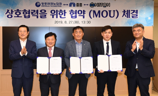 ▲ 지난 8월27일 광주TP, 중흥건설, 넷온간에 진행된 MOU 체결 모습광주테크노파크 입주기업인 넷온이 81억5,000만원의 납품계약을 통해 기술력을 인정받고 새로운 도약의 계기를 마련했다.