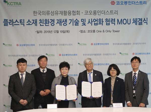 코오롱인더스트리(대표이사 장희구)는 19일 코오롱 원앤온리타워에서 친환경 공법을 기반으로 한 플라스틱 재활용 기술 개발 및 관련 사업 추진을 위해 한국의류섬유재활용협회(회장 구성자)와 업무협약(MOU)을 맺었다고 밝혔다.