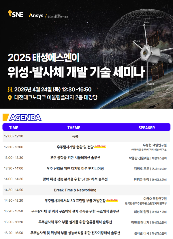 CAE 전문기업 태성에스엔이(대표 심진욱, 박인규)는 오는 4월24일 대전테크노파크 어울림플라자에서 첨단 항공우주 시뮬레이션 전략강화를 위한 ‘2025 태성에스엔이 위성·발사체 개발 기술 세미나’를 개최한다고 밝혔다.