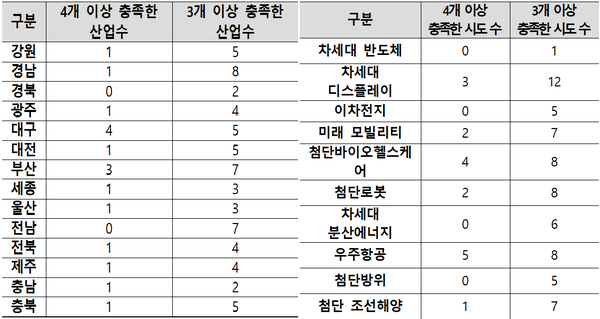 이어 부산과 전남이 각각 7개 산업이 전략산업 선정 기준을 충족했고, 강원, 대구, 대전, 충북(5개) 등이 그 뒤를 따랐다. 반면에 경북과 충남은 가장 적은 2개 산업만 충족 요건을 갖춘 것으로 조사됐다. 지역별 평균은 4.6개 산업이 충족하는 것으로 나타났다.