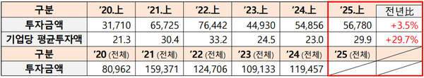 벤처투자회사·조합 기준으로 300억원 이상 투자를 유치한 기업의 수가 ’24년 상반기 1개사에서 ’25년 상반기 5개사로 늘어나는 등, 일부 기업에 큰 규모의 투자가 이루어져 기업당 투자규모도 전년대비 증가했다.