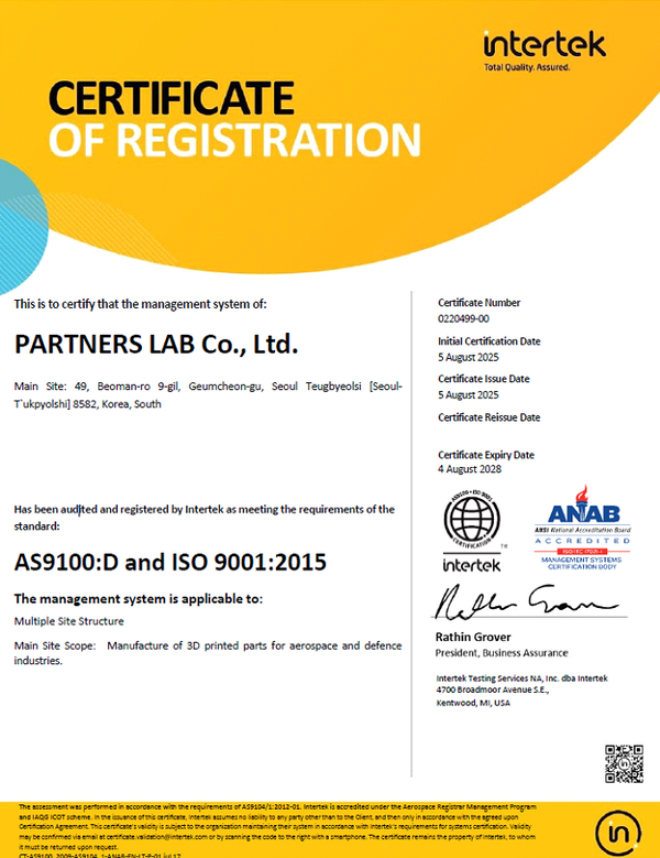 파트너스랩은 국내 적층제조 분야에서 AS9100D 인증을 획득한 몇 안 되는 기업 중 하나로, 이를 통해 항공우주 분야를 비롯한 자동차, 방위산업 등 국제 품질시스템에 맞춘 경영활동을 펼칠 수 있게 됐다.