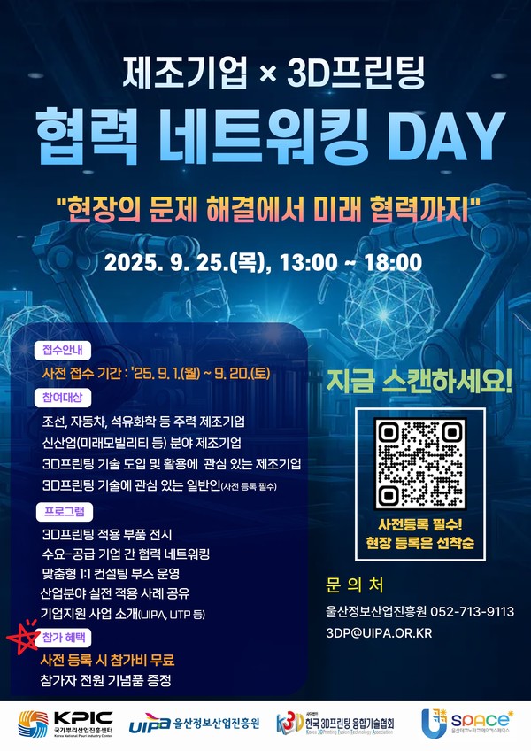 울산정보산업진흥원(UIPA)은 오는 9월25일 오후 1시부터 3D프린팅 벤처집적 지식산업센터에서 ‘제조기업X3D프린팅 협력 네트워킹 DAY’를 개최한다고 지난 11일 밝혔다.