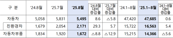 자동차 수출액은 전년동월대비 8.6% 증가한 55억불로 역대 8월 자동차 수출액 최고치를 기록했다. '25년 1~8월 누적 자동차 수출액도 477억불을 기록하며 역대 최고치를 기록했다.
