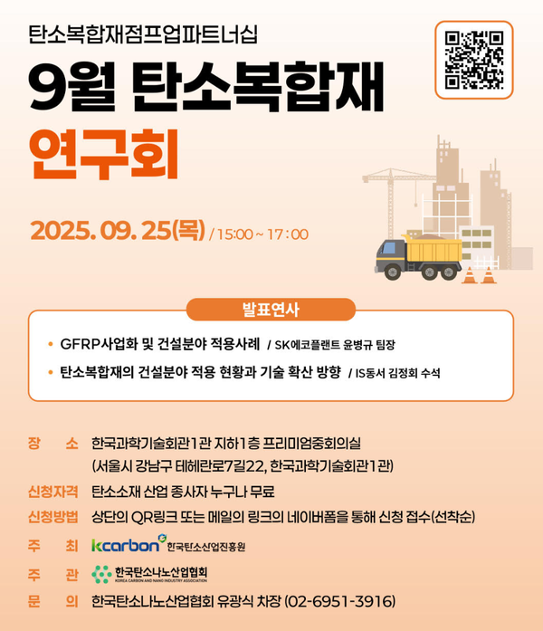 세미나는 탄소소재 산업 종사자라면 누구나 무료로 참여할 수 있으며, 건설 분야에서의 실질적인 적용 경험과 향후 산업 구조 변화를 논의하는 뜻깊은 자리가 될 것으로 기대된다.
