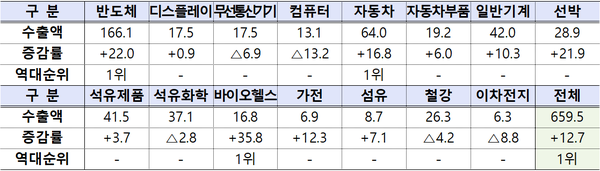 선박 수출은 21.9% 증가한 28.9억달러로 7개월 연속 증가했다. 일반기계 수출(42억달러, +10.3%)은 아세안, 중동, 중남미 등 신흥시장 호실적에 힘입어 올해 첫 플러스를 기록했다. 석유제품 수출(41.5억달러, +3.7%)도 제품가격 상승 영향으로 소폭 증가했다.