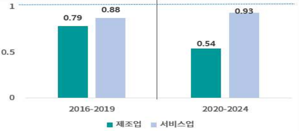 보고서에 따르면, 국내 COVID-19 발생 시점인 ’20년 1월 전후로 나누어 산업별로 비교한 결과, 제조업 생산과 AI지수 간 상관계수는 ’16~’19년 0.79에서 ’20~’24년 0.54로 낮아진 반면, 서비스업 생산의 상관계수는 각각 0.88, 0.93으로 높은 수준을 유지한 것으로 나타났다.