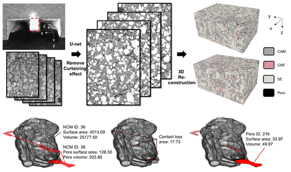 연구팀은 이러한 난제를 해결하기 위해 리튬 디플루오로포스페이트(LiDFP)를 활용해 양극 표면에 코팅층을 형성한 모델 시스템을 제작하고, 이를 기반으로 전고체전지의 열화 거동을 정밀 분석했다. 특히 머신러닝, 디지털 트윈(digital twin), 그리고 첨단 분석 기법을 도입해 양극과 전해질 사이에서 발생하는 화학적 열화(분해 반응)가 양극 입자의 반응 균일성과 미세구조 변화에 미치는 영향을 입자 단위부터 전극 단위까지 추적·규명했다.