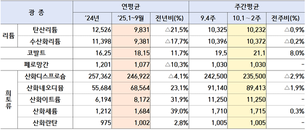 희소금속 중 리튬은 탄산리튬과 수산화리튬 모두 가격이 안정세를 보였다. 탄산리튬은 국경절 이후 시장에 충분한 재고가 확보되고 수요가 관망세를 이어가면서 가격이 유지됐고, 수산화리튬은 해외 수요 부진과 중국 외 지역(한국 등) 공급 증가가 맞물리며 가격 보합세가 나타났다.