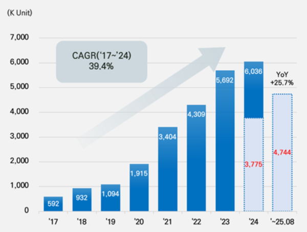 지역별로 살펴보면, 유럽은 같은 기간 256.1만대, 32% 성장으로 점유율은 54%로 증가했다. 강화된 탄소 규제가 수요 회복을 이끌었으나, 중국산 전기차의 점유율 확대가 가격 경쟁을 더욱 심화시키는 양상이다. BYD, NIO, Xpeng 등 중국 완성차의 헝가리, 스페인 등 현지 투자 본격화와 함께, 역내 생산 유도 정책과 대중국 견제 조치가 충돌하며 정책 리스크가 공존하고 있는 상태이다.