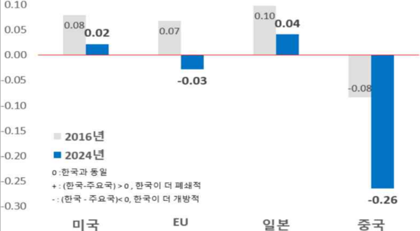 보고서는 한국은 미국(+0.02), 일본(+0.04)보다는 다소 규제가 강하지만, EU(-0.02), 중국(-0.26)에 비해서는 개방적인 것으로 나타나 주요국 사이에서 ‘중간적 위치’를 차지하고 있다고 설명했다.