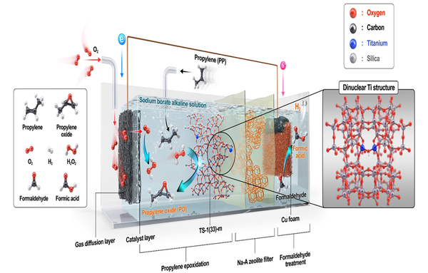 생산된 과산화수소는 시스템 안에 별도로 주입된 프로필렌과 반응해 프로필렌 옥사이드를 만든다. 연구팀은 이 산화 반응에 필요한 촉매의 구조를 새롭게 설계해 생산성을 크게 높였다.