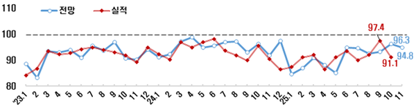 한국경제인협회(이하 한경협)는 매출액 기준 600대 기업을 대상으로 기업경기실사지수(Business Survey Index, 이하 BSI)를 조사한 결과, ’25년 11월 BSI 전망치는 기준선 100을 하회한 94.8을 기록했다고 28일 밝혔다.