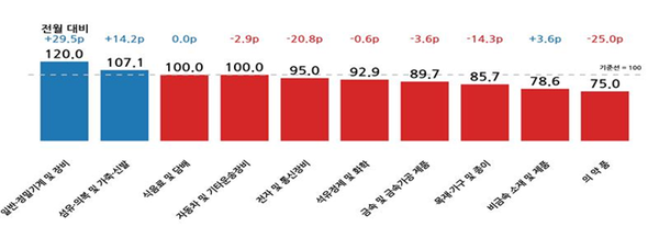 제조업 세부 업종(총 10개) 중에서는 일반·정밀기계 및 장비(120)와 섬유·의복 및 가죽·신발(107.1)이 호조를 보였다. 기준선 100에 걸친 식음료 및 담배(100) 자동차·선박 및 기타운송장비(100)를 제외한 의약품(75) 등 나머지 6개 업종은 부진 전망을 기록했다.