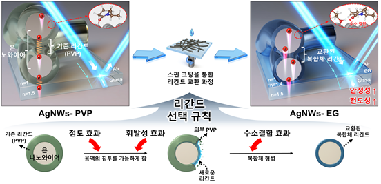 연구팀은 에틸렌글리콜(EG) 용액을 이용해 PVP 절연막을 손쉽게 교체하는 기술을 개발했다. 은 나노와이어를 에틸렌글리콜 용액에 담아 빠르게 회전시키면, PVP가 걷혀 나가고 전기가 통하는 새 막이 형성된다. 이 막은 전류 흐름을 높이는 동시에 은 나노와이어를 수분으로부터 보호하고 투명도까지 개선하는 역할을 한다.