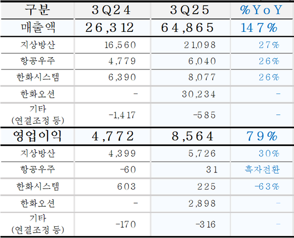 ▲  한화에어로스페이스 `25년 3분기 실적(단위: 억 원)(출처: 한화에어로스페이스)한화에어로스페이스가 3분기에도 내수·수출 동반 성장과 지상방산 부문의 견고한 수익성, 한화오션의 실적 호조로 견고한 성장을 이어갔다.