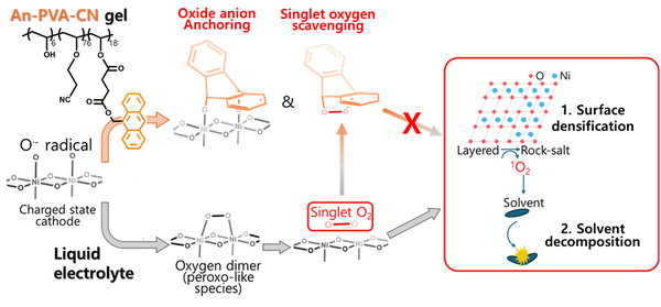 개발된 전해질의 안트라센(An)은 전극 표면의 불안정한 산소와 결합함으로써 불안정한 산소끼리 결합하는 반응 단계를 차단한다. 불안정한 산소끼리 결합하게 되면 활성산소 ‘씨앗’인 산소 이합체가 생긴다. 해당 안트라센은 이미 생긴 활성산소까지 포획해 제거함으로써 이중 보호 기능을 할 수 있다. 전해질의 또 다른 성분인 니트릴(-CN) 작용기는 양극의 니켈 금속을 안정화해 니켈이 녹아 나오거나 양극 구조가 변형되는 것을 막아준다.