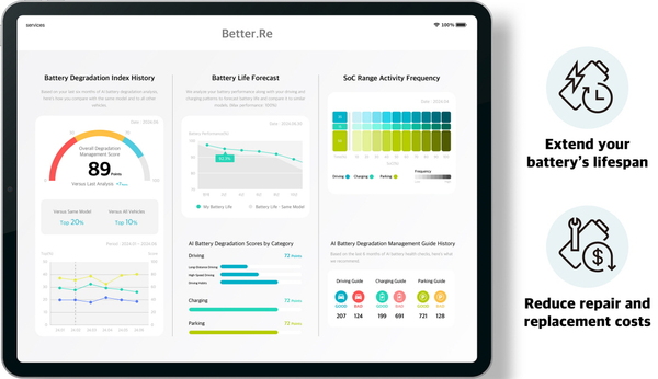 LG에너지솔루션의 Better.Re 솔루션은 ‘고객 유도형’과 ‘제어형’ 방식으로 나뉜다. 고객 유도형은 배터리 퇴화에 영향을 미치는 16가지 사용자 행동 인자를 바탕으로 맞춤형 수명 관리 가이드를 제공하고, 운전자의 습관 개선을 통해 배터리 성능을 최적화해 퇴화를 늦추는 방식이다.