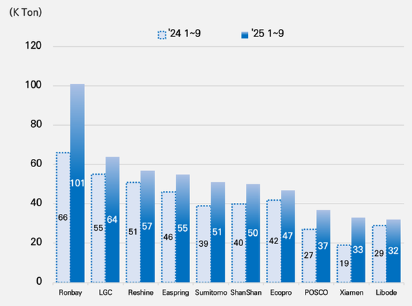 다만 전반적으로는 중국계 기업들의 약진이 더욱 두드러진다. Reshine, ShanShan, Easpring 등 주요 업체가 치열하게 순위를 다투고 있으며, 내수 기반 수요와 원가 경쟁력, 대규모 증설을 무기로 글로벌 점유율을 꾸준히 넓히는 모습이다.
