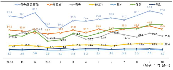 지역별로는 △대만(60%↑) △유럽연합(29.2%↑) △미국(5.8%↑) 중국(홍콩 포함, 4.9%↑) △ 베트남(3.8%↑)이 증가세를 이어갔지만 일본(△4.6%)은 감소했다.