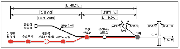 본 사업은 ’33년 하반기 개통을 목표로 국비 1조 5,859억원을 투입해 대야에서 새만금 신항만까지 단선철도 48.3km를 잇는 사업으로, 정거장 7개소가 포함된다.