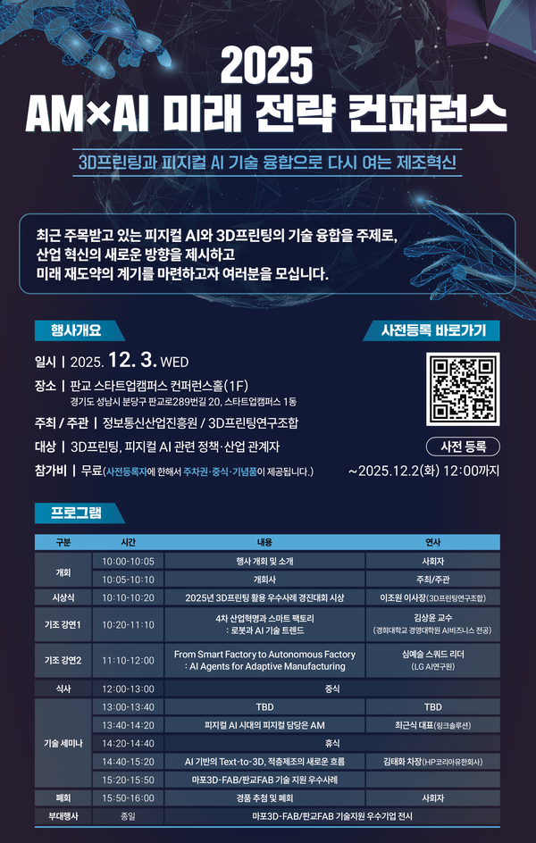 정보통신산업흥원(NIPA)이 주최하고 3D프린팅연구조합이 주관하는 ‘2025 AM x AI 미래 전략 컨퍼런스‘가 오는 12월3일 판교 스타트업캠퍼스 컨퍼런스홀에서 개최된다.