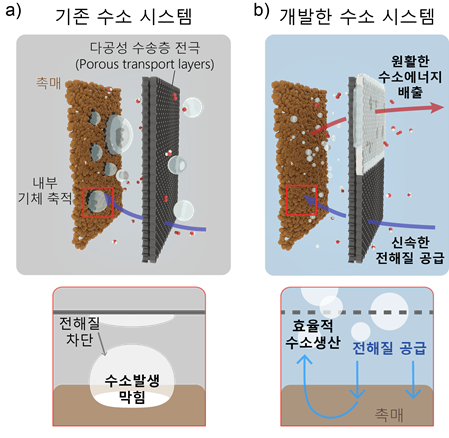 수전해 장치는 물과 전기로 그린 수소를 생산하는 장치이다. 수소는 이 장치 전극의 촉매 표면에서 화학 반응해 만들어진다. 이때 수소 기체가 제때 빠져나가지 못하고 기포 형태로 촉매 표면을 덮어버리면 반응이 막혀 문제가 된다. 생산 반응이 일어나는 촉매 표면적이 줄어들기 때문이다.