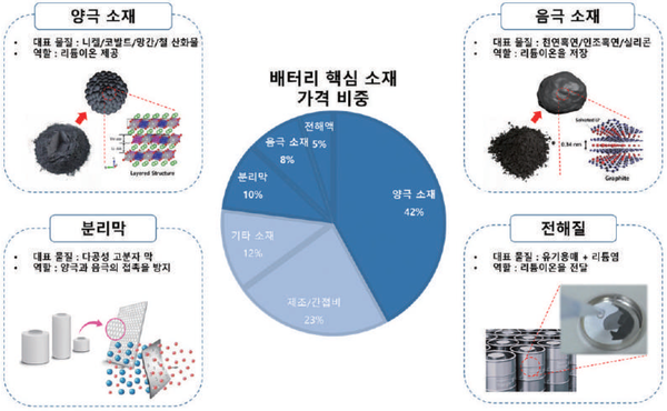 따라서 이차전지의 성능 및 특성을 고도화하려면 4대 핵심 소재 개발이 선행되어야 하며, 이들 핵심 소재를 이용한 셀 제조 기술이 병행돼야 한다. 이차전지의 4대 핵심 소재의 주요 역할과 가격 비중은 <그림 3>과 같다.