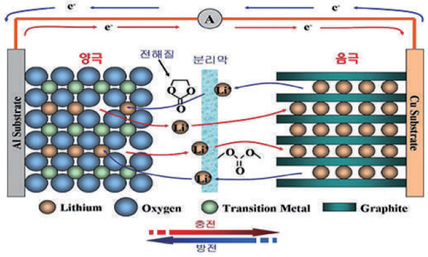 외부 전기에너지를 이용해 충전 시 양극의 리튬은 리튬이온과 전자로 분리되며, 전자는 외부 도선을 따라 음극으로 이동하고, 이온은 전해질을 통해 음극으로 이동해 리튬으로 결합되어 저장된다. 이후 방전 시 리튬이온이 양극으로 돌아가게 되고 전자가 도선을 따라가면서 전기에너지가 발생하게 된다.
