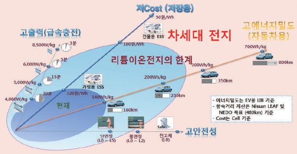 이와 함께 전기차 및 재생에너지의 저장 수단으로서 대형전지 수요가 급증하면서 기존 리튬이온전지의 안정성과 가격, 에너지밀도, 출력과 관련된 한계점이 명확하게 나타났다.