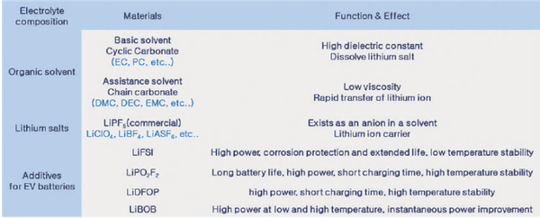 특히 전기차용으로 저온·고온에서 안정성을 부여하고 고속 충전에 사용하거나 출력을 올려줄 첨가제가 개발되고 있다.