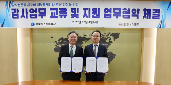 ▲ 한국가스기술공사와 한전KDN은 `감사전문성 제고와 내부통제강화 역량 향상을 위한 업무협약`을 체결했다.한국가스기술공사(사장직무대행 진수남 이하 공사)가 한전KDN과 협력해 내부통제를 개선하고 감사역량을 향상시켜 나간다.
