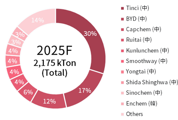 BYD는 인하우스(in-house, 자체 소비물량) 전해액 물량이 약 36만톤(16.6%)으로 2위를 차지하며 자사 전기차 판매량을 바탕으로 성장세를 이어가고 있다. 또한 Capchem은 25.6만톤 (11.8%), Ruitai New Materials는 9.5만톤(4.4%)을 기록하며 Top-tier 그룹 내 위치를 공고히 할 것으로 보인다.