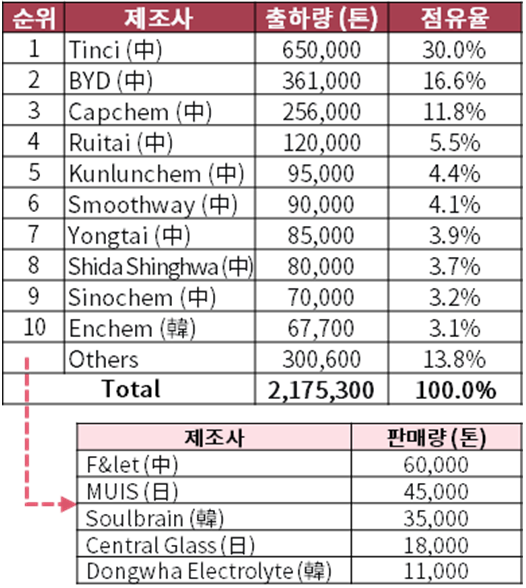 ▲ 글로벌 이차전지 전해액 제조업체별 출하량 및 점유율(츨처: LIB 4대 소재 SCM 분석 및 중장기 시장전망, SNE리서치 )