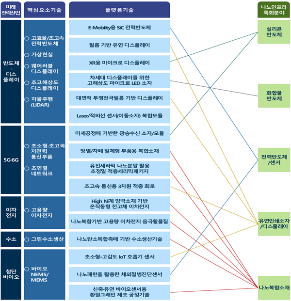 이에 산업통상부는 국가나노인프라협의체를 중심으로 △반도체·디스플레이 △5G·6G · 패키징 △이차전지 △수소 △첨단바이오 등 국가필수전략기술 수요와 시장성과 연계된 ‘첨단나노 소재·부품 플랫폼 기술’ 16개를 선정하고 2023년부터 올해까지 1단계 사업으로, 첨단소재부품 제작지원을 위한 공정플랫폼 기술개발을 지원했다.