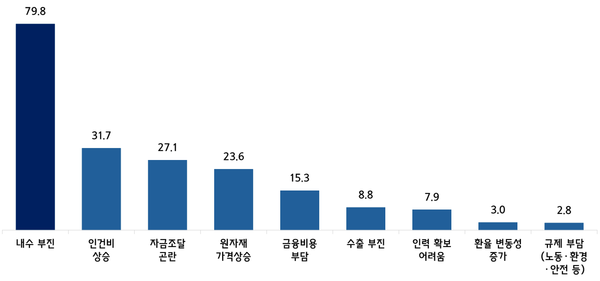 ’25년 경영난의 주요 요인(복수응답)은 ‘내수 부진’(79.8%)이 가장 많았고, 뒤이어 △인건비 상승(31.7%) △자금조달 곤란(27.1%) △원자재 가격 상승(23.6%) 등 순으로 나타났다.